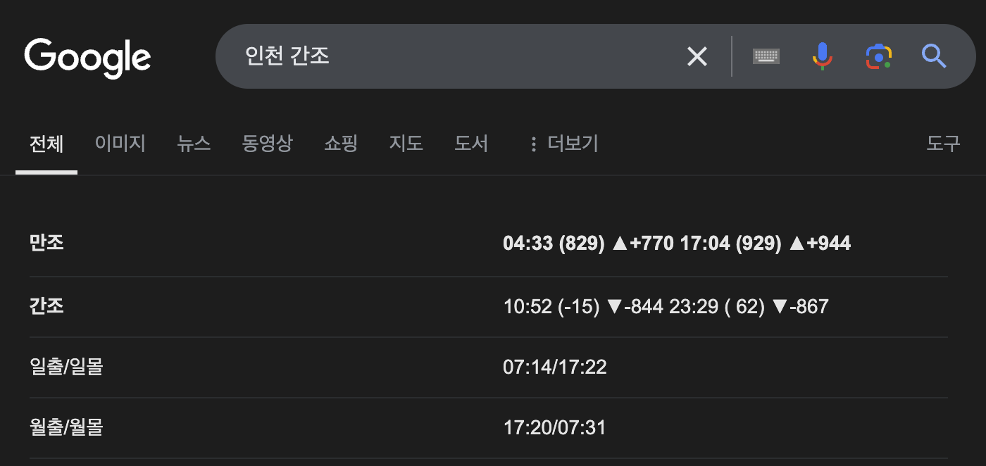 구글 검색 : 구글 검색창에 "인천 간조" 형태로 지역명과 간조/만조를 입력하고 물때 정보를 볼 수 있는 간단한 검색방법을 이용하면 초보자도 쉽게 확인 가능합니다.