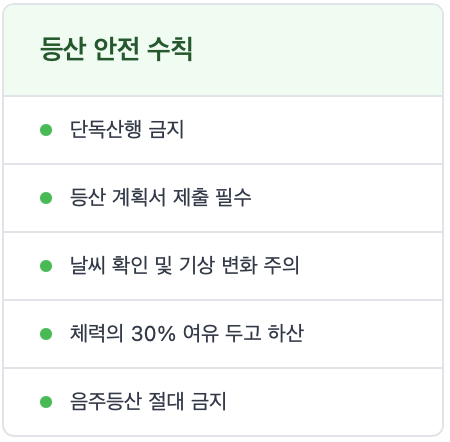 산행에서는 미리 기본적인 안전수칙을 기억하고 지키는 것은 나와 동행자를 위한 필수지침입니다. 안전장비 준비부터 시작해서 위험지역 안전수칙까지 꼭 확인하고 동반하는 일행과도 공유해서 만약을 대비하는 준비가 필요합니다.