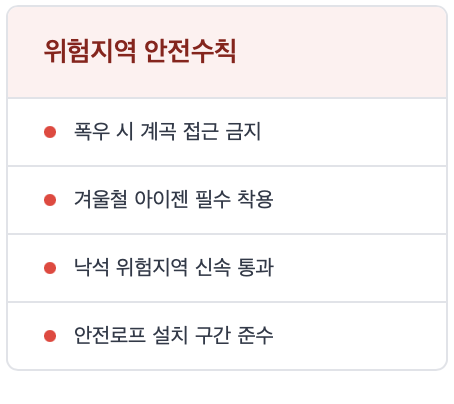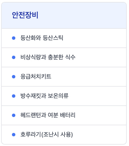 산행에서는 미리 기본적인 안전수칙을 기억하고 지키는 것은 나와 동행자를 위한 필수지침입니다. 안전장비 준비부터 시작해서 위험지역 안전수칙까지 꼭 확인하고 동반하는 일행과도 공유해서 만약을 대비하는 준비가 필요합니다.