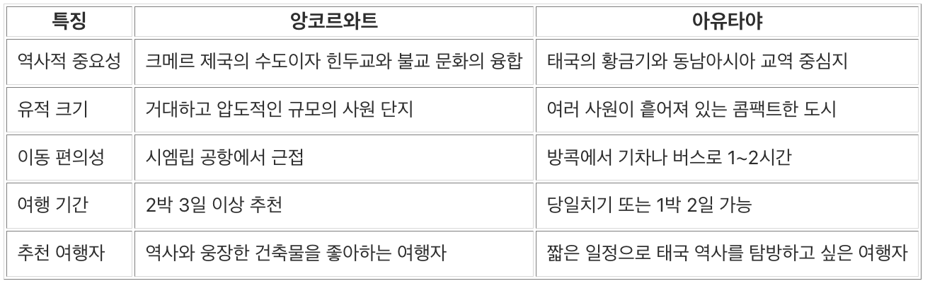 앙코르와트와 아유타야는 모두 동남아시아의 풍부한 역사를 탐방할 수 있는 특별한 여행지입니다. 장엄한 규모와 섬세한 부조를 보고 싶다면 앙코르와트를, 짧은 일정으로 효율적으로 탐방하고 싶다면 아유타야를 추천합니다. 당신의 여행 스타일에 맞는 선택으로 동남아 역사 여행을 만끽해보세요!
