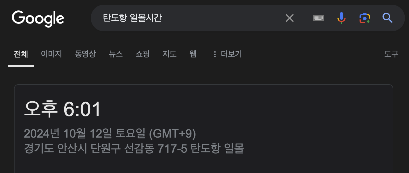 보다 더 간단한 방법으로는 구글 검색을 통해 바로 일몰 시간을 확인하는 방법인데요. 구글 앱이나 크롬 검색창에 “탄도항 일몰 시간”이라고 입력하면 오늘의 일몰 시간을 바로 확인할 수 있습니다. 매일 업데이트된 정보를 제공하므로 가장 최신 정보를 얻을 수 있는데요, 어찌보면 가장 쉽고 빠르게 일몰시간을 확인하는데 적합한 방법입니다.