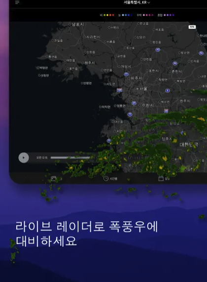 - 실시간 레이더 지도로 폭풍 이동 경로를 추적하며, 심각한 날씨(태풍, 눈보라 등)에 대한 경고를 즉시 알립니다.