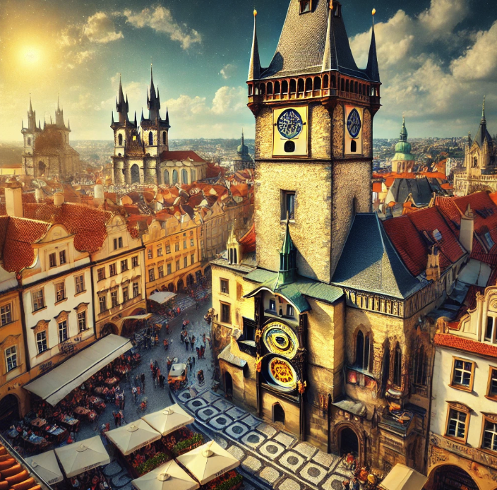 천문시계(Orloj)는 1410년에 제작된 유럽에서 가장 오래된 작동 중인 천문시계로, 프라하의 랜드마크 중 하나입니다. 시계는 시간뿐 아니라 태양과 달의 위치, 황도 12궁, 그리고 달의 위상을 표시하며 정교한 기계 기술과 예술성이 돋보입니다.
